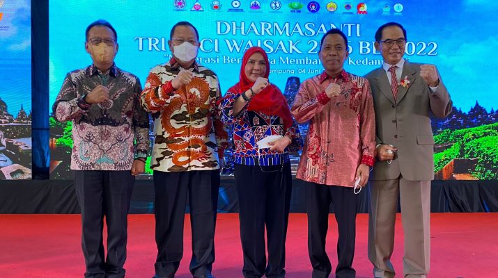 Linkarutama.com – Ketua DPRD Provinsi Lampung menghadiri Dharmasanti Tri Suci Waisak 2566/2022 dengan tema moderasi beragama membangun kedamaian yang berlangsung di Yayasan Hakka Metta Sarana, Telukbetung Selatan, Kota Bandar Lampung, Sabtu (4/6/2022).
