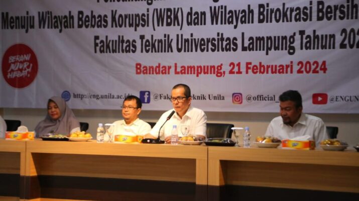 Linkarutama.com – Fakultas Teknik (FT) Universitas Lampung (Unila) menggelar pencanangan Zona Integritas (ZI) menuju Wilayah Bebas dari Korupsi (WBK), Wilayah Birokrasi Bersih dan Melayani (WBBM), Rabu pagi (21/2/2024), di Aula Gedung Dekanat lantai dua FT Unila.