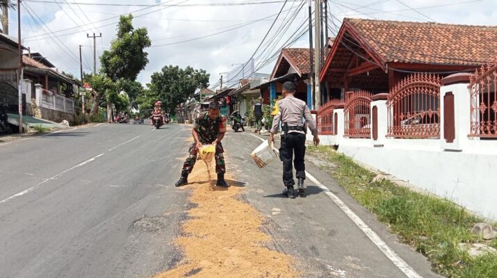 Setibanya di lokasi, Babinsa dan Bhabinkamtibmas beserta RT dan Linmas setempat bergerak cepat menimbun solar yang tercecer di jalan dengan menggunakan pasir agar jalan tersebut tidak licin.