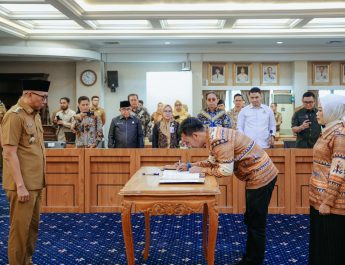 Linkarutama.com – Pj. Gubernur Lampung Samsudin menandatangani perjanjian pemegang saham atau Shareholder Agreement (SHA) antara Pemerintah Provinsi Lampung dengan PT. Bank Pembangunan Daerah Jawa Timur (Bank Jatim) atas Kelompok Usaha Bank (KUB) Bank Lampung dengan Bank Jatim, di Ballroom Golden Tulip Holland Resort, Kota Batu, Jawa Timur, Jum’at (8/11/2024).