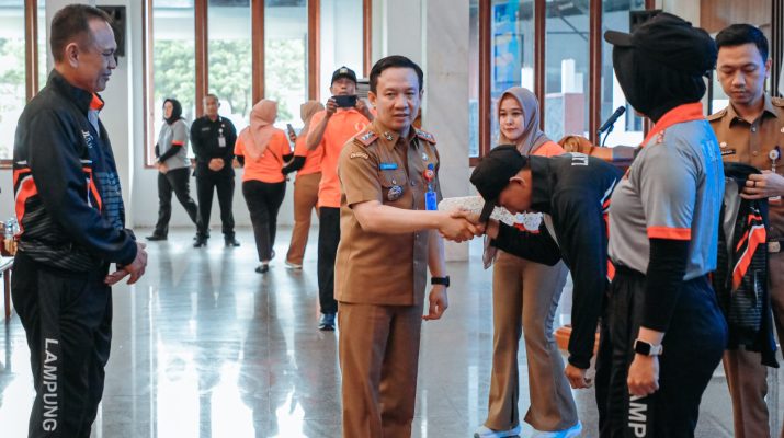 Linkarutama.com – Sekdaprov Lampung Marindo Kurniawan, mewakili Gubernur Lampung Rahmat Mirzani Djsusal, melepas 80 atlet kontingen Lampung pada ajang Pekan Olahraga Nasional (PON) Bela Diri II Tahun 2025 di Mahan Agung, Bandarlampung, Selasa (7/10/2025).