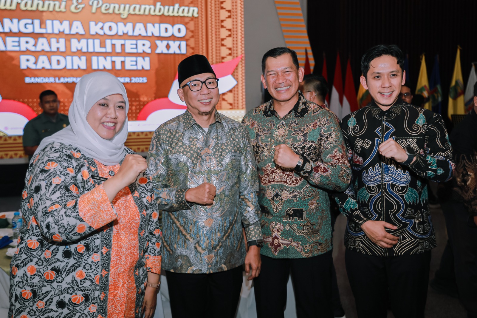 Linkarutama.com – Gubernur Lampung Rahmat Mirzani Djausal menggelar acara silaturahmi dan penyambutan Pangdam XXI/Radin Inten Mayjen TNI Kristomei Sianturi di Provinsi Lampung, di Aula Mahan Agung, Rumah Dinas Gubernur Lampung, Bandar Lampung, Senin (13/10/2025).