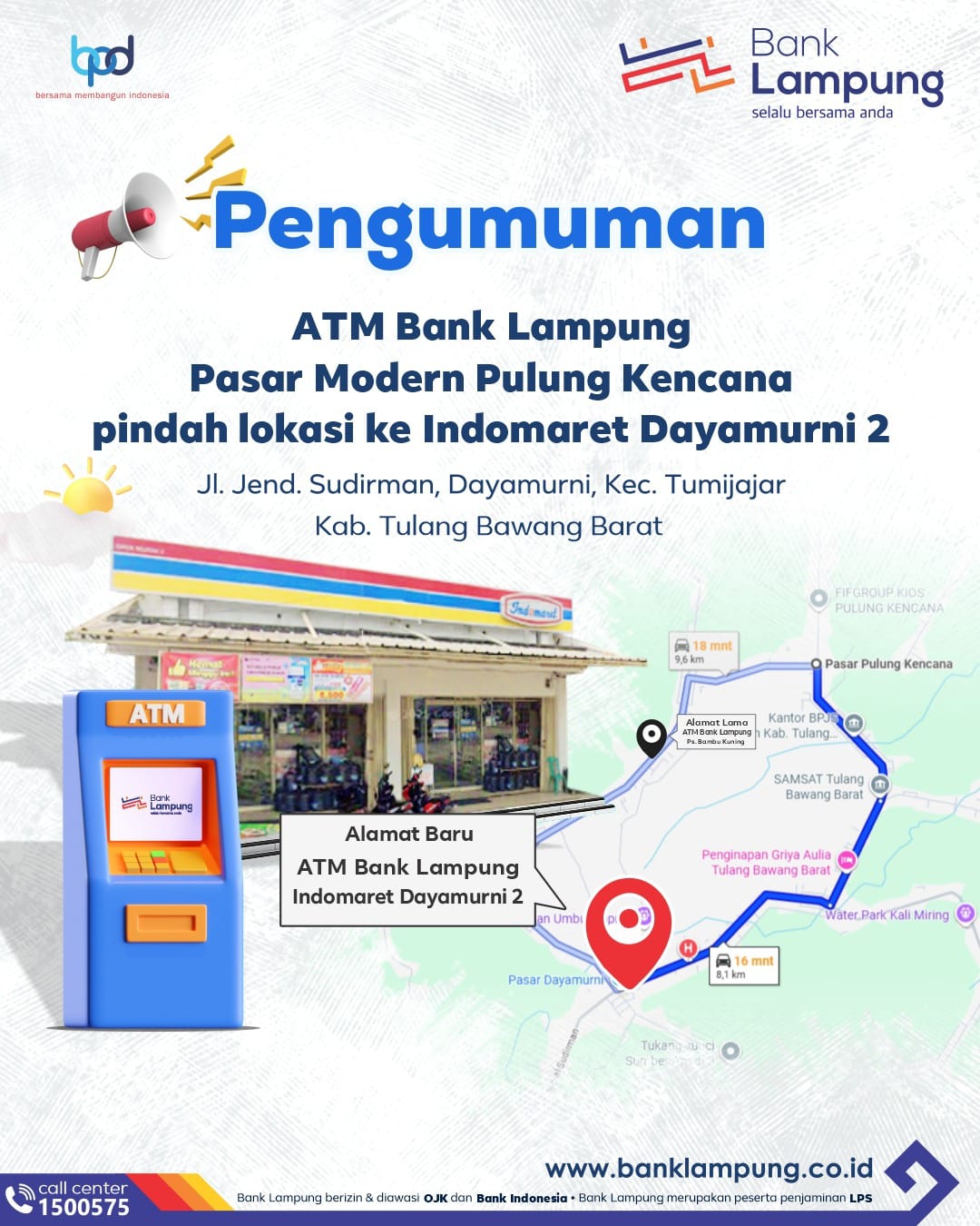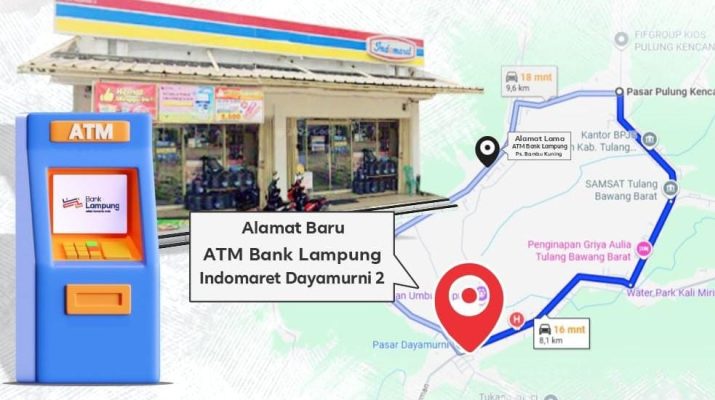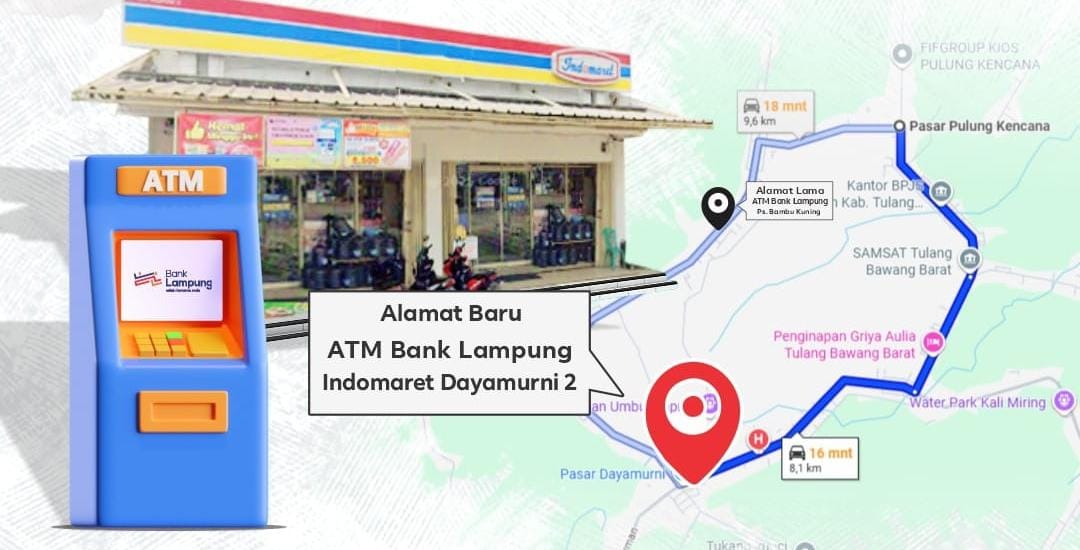 Linkarutama.com – PT Bank Pembangunan Daerah Lampung (Bank Lampung) mengumumkan pemindahan lokasi layanan ATM yang sebelumnya berada di Pasar Modern Pulung Kencana. ATM Bank Lampung tersebut kini resmi beroperasi di lokasi baru, yakni Indomaret Dayamurni 2 yang beralamat di Jalan Jenderal Sudirman, Dayamurni, Kecamatan Tumijajar, Kabupaten Tulang Bawang Barat.