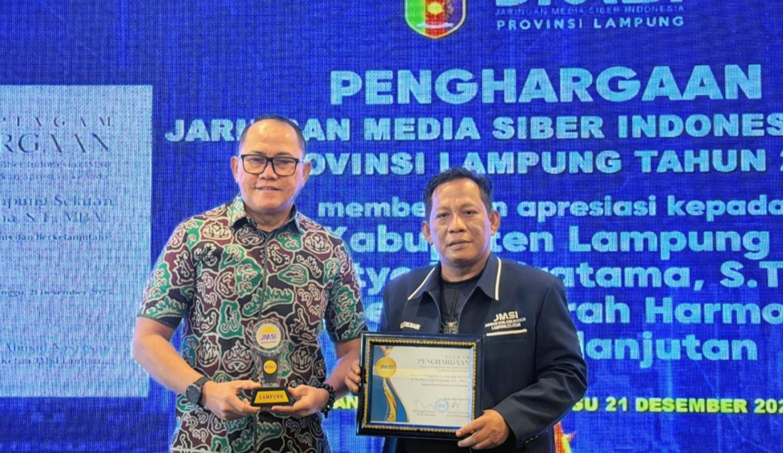 Penghargaan tersebut diserahkan dalam rangkaian Musda II JMSI Lampung yang digelar di Hotel Azana, Bandar Lampung, Minggu (21/12/2025).