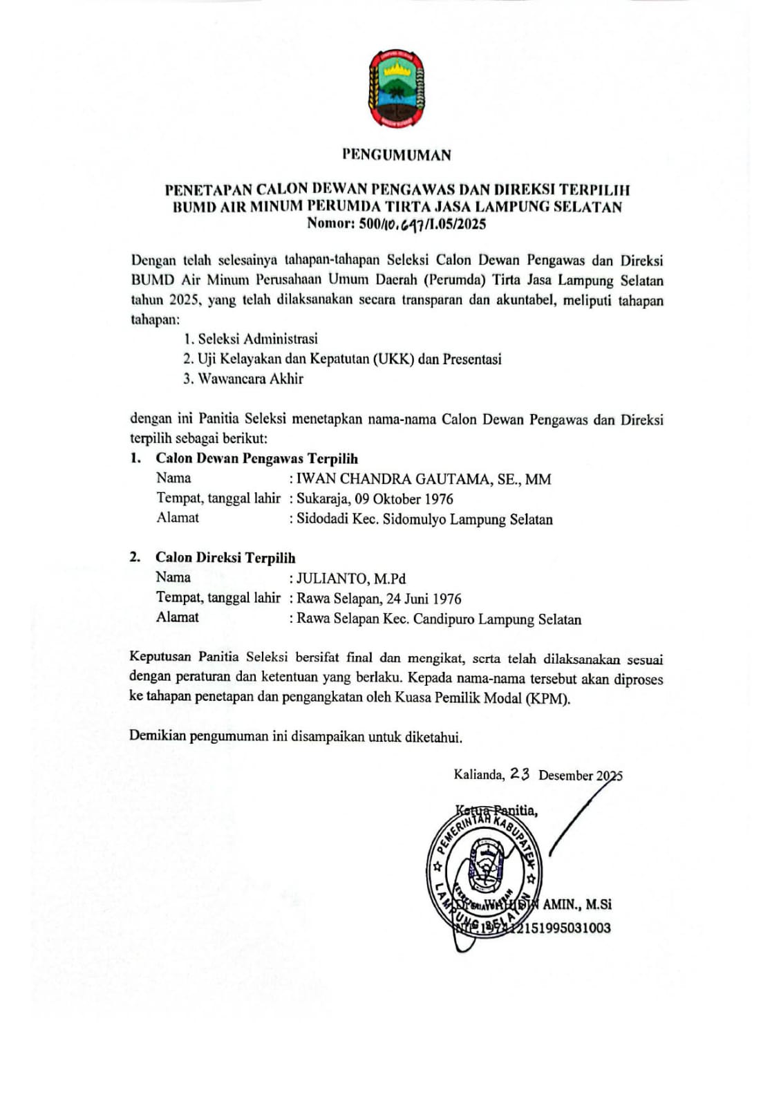 Pengumuman Penetapan Calon Dewan Pengawas dan Direksi Terpilih PERUMDA Tirta Jasa Tahun 2025